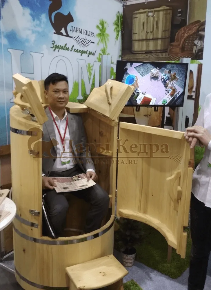 Овальная фитобочка из кедра - это мини парная, которую можно использовать не только в спа-салонах, но и дома. Овальная модель более просторна и удобна в использовании. Толщина стенок составляет 40-45 мм, что позволяет увеличить срок службы изделия. Верхний скос делает положение головы более комфортным и улучшает обзор. Она оборудована откидными створками, дверцей и отверстием для головы. Во время парения человек сидит внутри кедровой бочки, а голова находится снаружи. Благодаря этому исключается возможность перегрева. Подлокотники из кедра, встроенные ручки на створках и двери делают эксплуатацию более удобной.